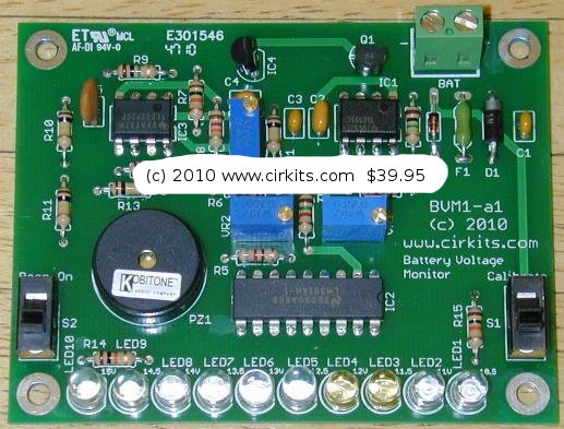Attach the battery terminals to the BVM input connectors. The LED array will blink to show the battery voltage when the Calibrate switch S1 is turned off. The LED array will stay on if you turn on the Calibrate switch S1, however, the battery will use a little more power in this mode. For showing DC voltages that fluctuate quickly, the calibrate mode is helpful. If the input voltage is less than 10.5V, all of the LEDs will switch off, and if the value is greater than 15V, the white LED will remain on.