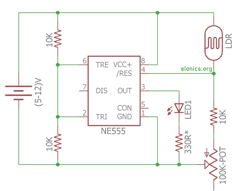 This circuit uses a Light Dependent Resistor (LDR) and a 555 Timer IC to create a light-sensitive switch. The LDR changes its resistance based on light intensity—higher resistance in the dark and lower resistance in light. This variation controls the voltage at the reset pin (Pin 4) of the 555 Timer IC. When the voltage exceeds 0.8V, the 555 timer is activated, and its output can control an LED or other devices. The circuit also includes a voltage divider and resistors to ensure proper voltage levels for the timer’s operation. This setup is commonly used in applications like automatic streetlights, wardrobe lights, and light-sensitive alarms.