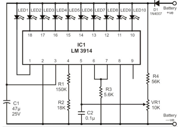 This circuit monitors the charging process of a battery by displaying its voltage level using a series of LEDs. It is calibrated using a 12.65V input, where LED 10 lights up to indicate a fully charged state. As the voltage decreases, the LEDs sequentially illuminate, with LED 1 lighting up at approximately 11.85V, indicating the lowest charge level. The LEDs are grouped to represent battery capacity: LEDs 8-10 indicate more than 50%, LEDs 4-7 indicate 30%-50%, and LEDs 1-3 indicate less than 30%. The circuit operates in DOT mode by default (only one LED light at a time) but can be switched to BAR mode for continuous LED display. It consumes less than 10mA and includes a 1N4007 diode for polarity protection.