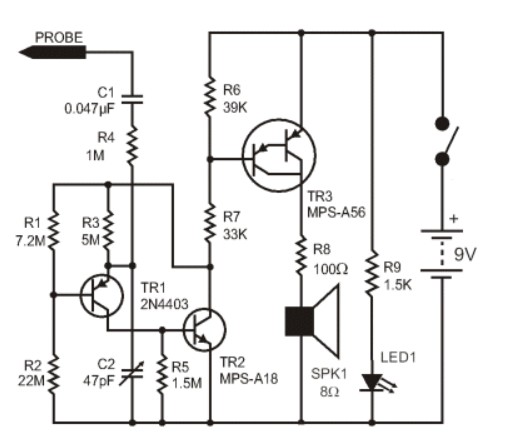 This capacitance beeper circuit generates an audible tone whose frequency varies with the capacitance of a connected component. A Darlington transistor oscillates when a capacitor is detected, producing a beep that changes pitch based on capacitance size.