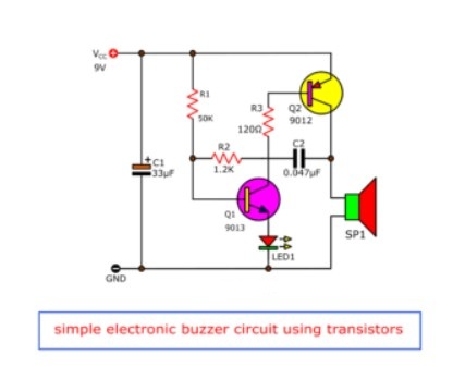This circuit is a simple and cost-effective electronic buzzer, powered by a 9-volt battery. It uses a pair of matched transistors (CS 9012 and CS 9013) along with resistors and capacitors to form an oscillator, generating a sound signal. The frequency of the output sound can be adjusted by changing the resistor and capacitor values. An LED lights up to indicate the circuit’s operation. This buzzer circuit is ideal for low-cost signalling applications and operates safely without the risk of electric shock from mains voltage.