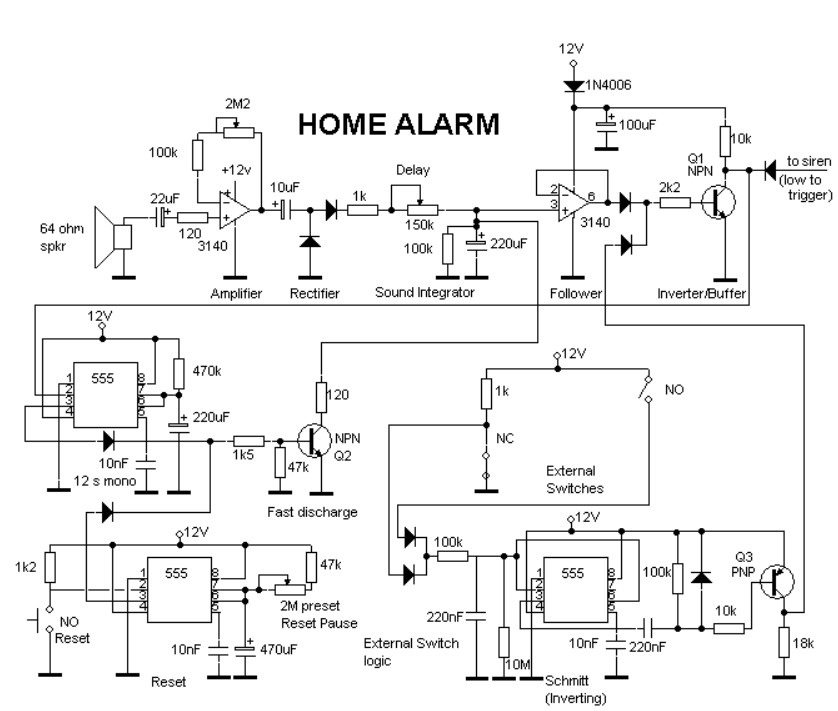 This Home Alarm Circuit detects sound using an electret microphone and a Schmitt Trigger-based circuit to activate a siren when triggered. It uses a 74C14 IC (Schmitt Inverter gates) along with a bootstrap transistor arrangement to process the signal. When a sound is detected, the circuit momentarily changes state, turning on a transistor and triggering the alarm. An EXIT button allows the user to disable the siren temporarily while leaving the property.