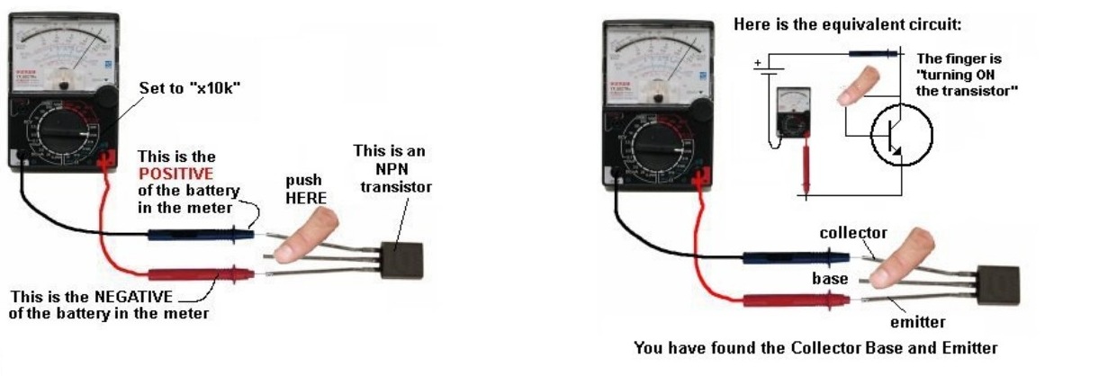 - If the black probe is on the base and the red probe causes the meter to swing nearly full scale, you have an NPN transistor.