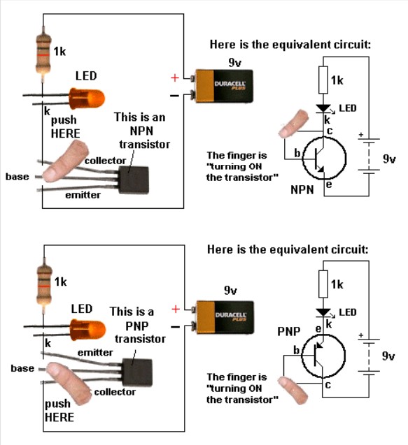 The leads of some transistors may need to be bent to match the pin positions shown in the diagrams. This adjustment helps illustrate how the transistor is activated. This method is applicable to NPN, PNP, and Darlington transistors.